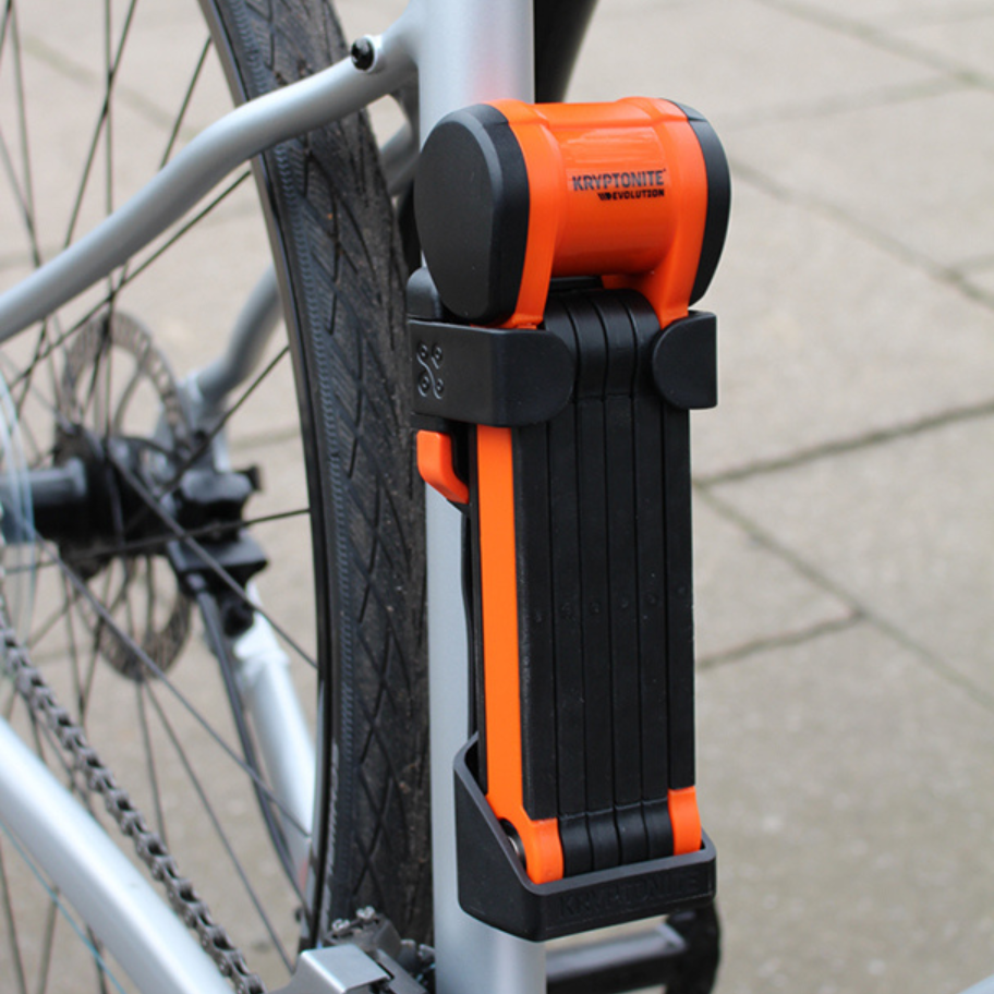 The Kryptonite Evolution folding lock is an excellent choice when you need high security for your bike in a portable format. Its 90 cm length makes locking easy, and the improved mount allows the lock to be carried conveniently. The lock releases from the mount effortlessly by pressing a side button, making it faster and simpler to use. The soft yet durable coating protects your bike from scratches and dings.