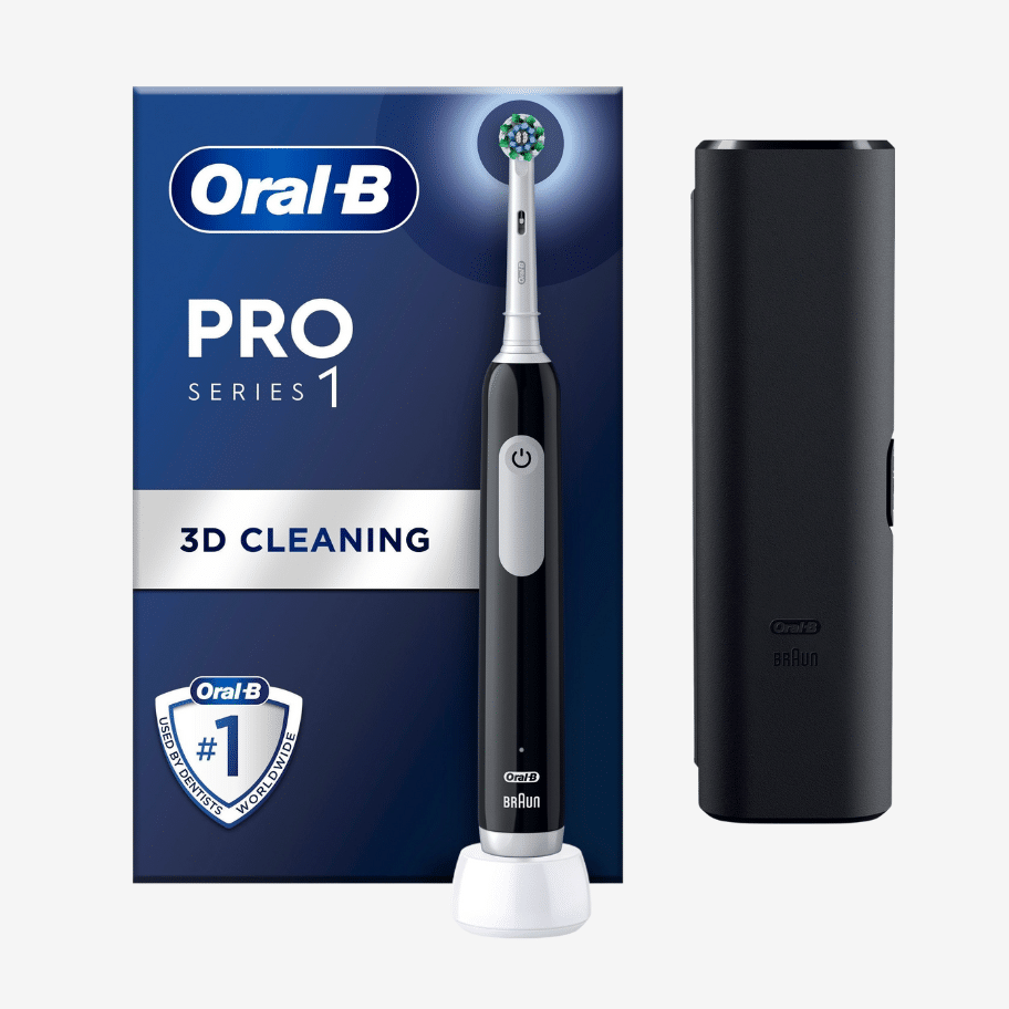 Paketissa: Oral-B Pro Series 1 Black -sähköhammasharjarunko, 1 vaihtoharja, 1 matkakotelo