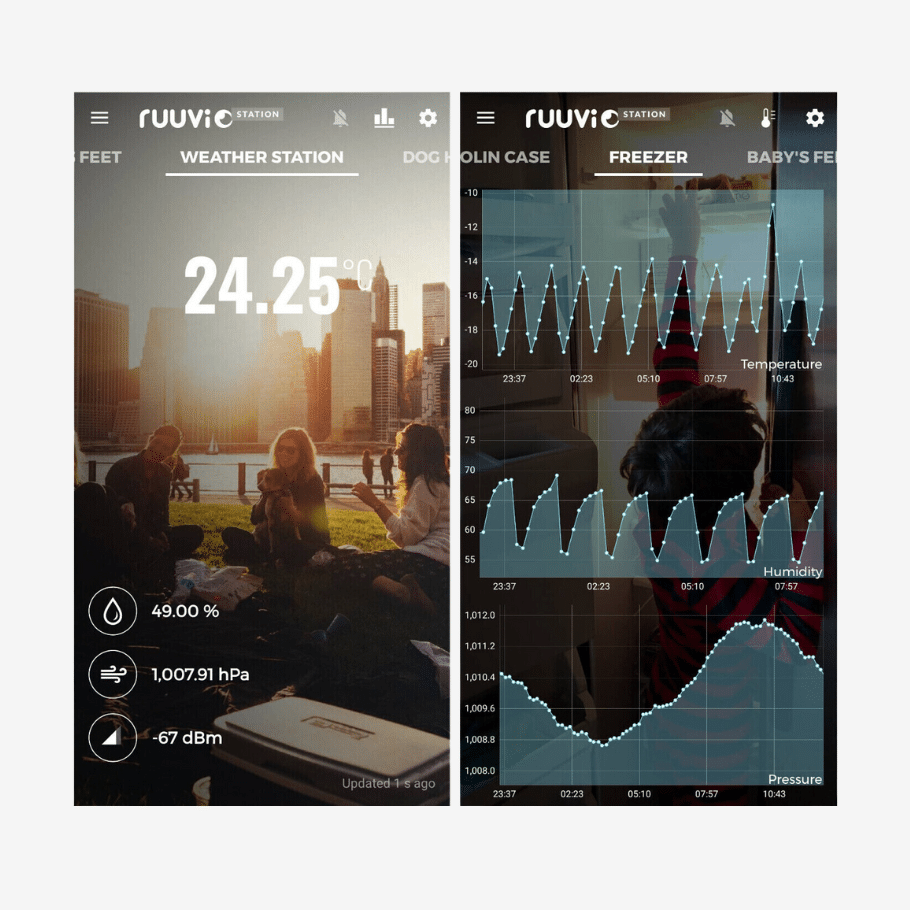 Ruuvi Station -mobiilisovellus näyttää siihen lisättyjen lähellä olevien antureiden tiedot puhelimen näytöllä reaaliajassa. Voit helposti seurata esim. lämpötilan tai ilmankosteuden kehitystä ja ajastaa hälytyksiä ja ilmoituksia. Laita RuuviTag saunaan ja saat välittömästi ilmoituksen, kun haluttu lämpötila on saavutettu. Sovellus kykenee lähettämään ilmoituksen myös silloin, kun yhteys anturiin katkeaa (ei enää kantoalueen sisällä).